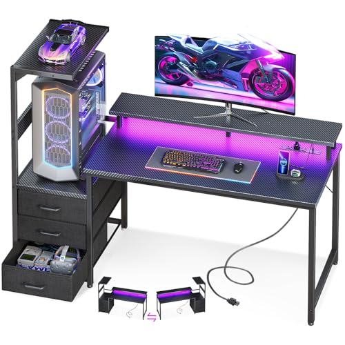 AODK 52 Inch Gaming Desk with USB Charging Ports & LED Light- Reversible Computer Desk with Storage Shelves & Monitor Stand, Modern Gamer Desk Table with Fabric Drawers, Black