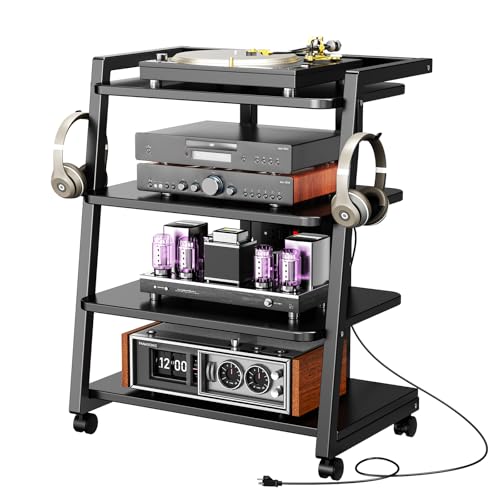 CABTE Mobile AV Media Stand with Outlets and 4 Rolling Caster Wheels, 4-Tier Rolling TV Stand for Gaming Console, Stereo, DVD Player, Sturdy Metal Frame, Versatile Living Room,Bedroom (Black)