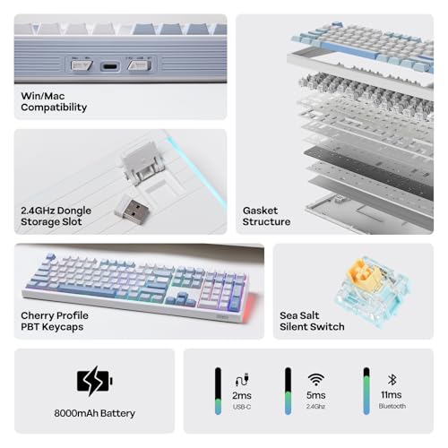EPOMAKER TH108 Full Size Mechanical Keyboard, Wireless Gaming Keyboard with 8000mAh Battery, Creamy Gasket, 108 Keys, Hot Swap, Custom Driver, RGB Backlight (Blue&White, Sea Salt Silent)