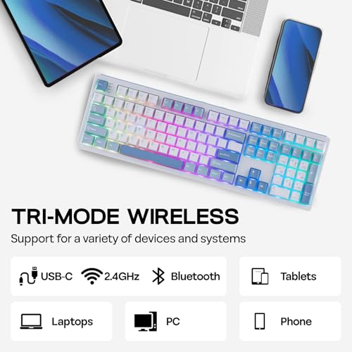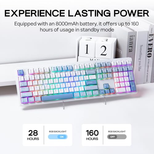Long-Lasting Wireless Keyboard: Liberate your setup with the ultimate freedom of a stable wireless keyboard boasting the outstanding 8000mAh battery. Unlocking a realm of unrestricted movement and sustained performance with this tri-mode wireless keyboard, without frustrating cable drag hindering swift mouse movements, for seamless transition between up to 5 paired devices under cable, 2.4Ghz and Bluetooth modes. PC, Mac laptop, Android tablet or gaming console, whichever devices you game on, the 160-hour wire-free battery life make inconvenient mid-game recharge a worry in the past.