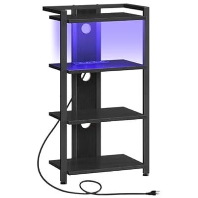 HOOBRO 4-Tier AV Media Stand with Charging Station and LED Light, Wooden Stereo Stand, Rack Audio Tower, Corner TV Stand, Entertainment Device, Black BB38UDCJ01